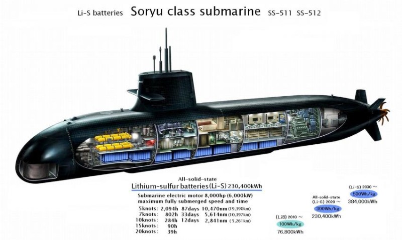 하지만 일본의 최신형 잠수함 타이게이는 처음부터 리튬이온전지에 최적화된 설계를 가지고 있습니다. 게다가 일본 정부는 타이게이급에 전고체(All-Solid) 리튬이온전지를 장착한다는 구상을 가지고 있는데요. 일본측 자료에 의하면 전고체 리튬이온전지에 최적화된 설계를 적용할 경우 오류함보다 5~9배 더 많은 중량당 에너지를 확보할 수 있게 됩니다.
