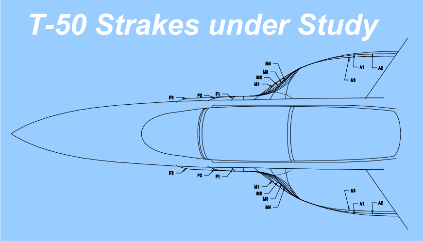 T-50 스트레이크에 대한 연구 사진에서도 알 수 있듯이 스트레이크의 각도와 크기를 어떻게 설정하는가에 따라 날개(주익)에 부딪치는 Vortex(소용돌이/와류)의 흐름이 달라지게 됩니다.