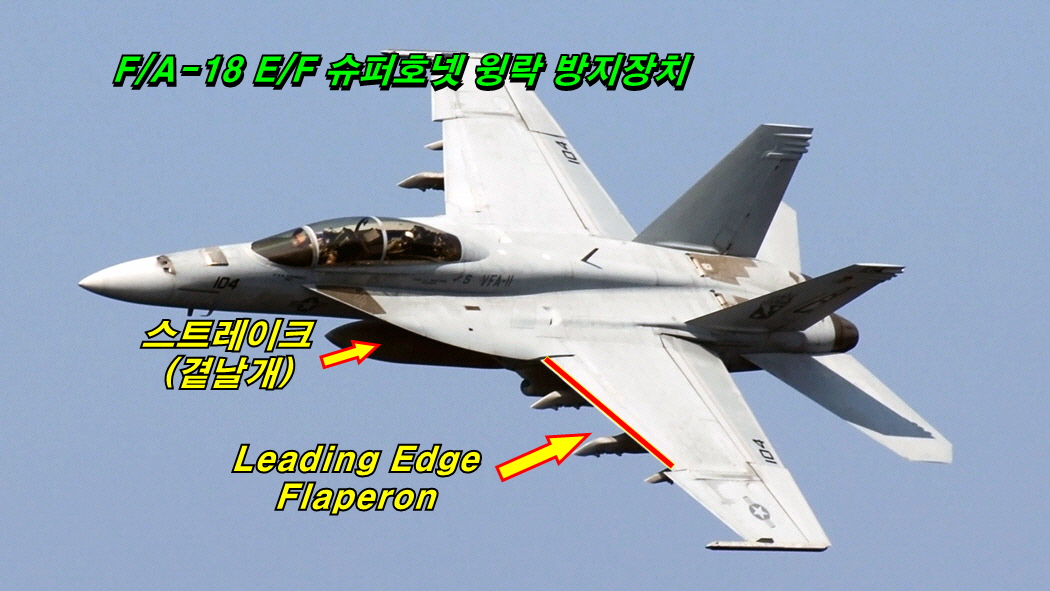 이제 본론으로 들어가게 되는데 T-7A와 유사한 형태를 지니고 있고 비슷한 비행 특성을 지닌 것으로 널리 알려져 있는 F/A-18 E/F 슈퍼호넷의 경우 날개 앞부분(Leading Edge)에 장착된 플래퍼론의 크기가 날개의 반 이상을 차지하고 있습니다.