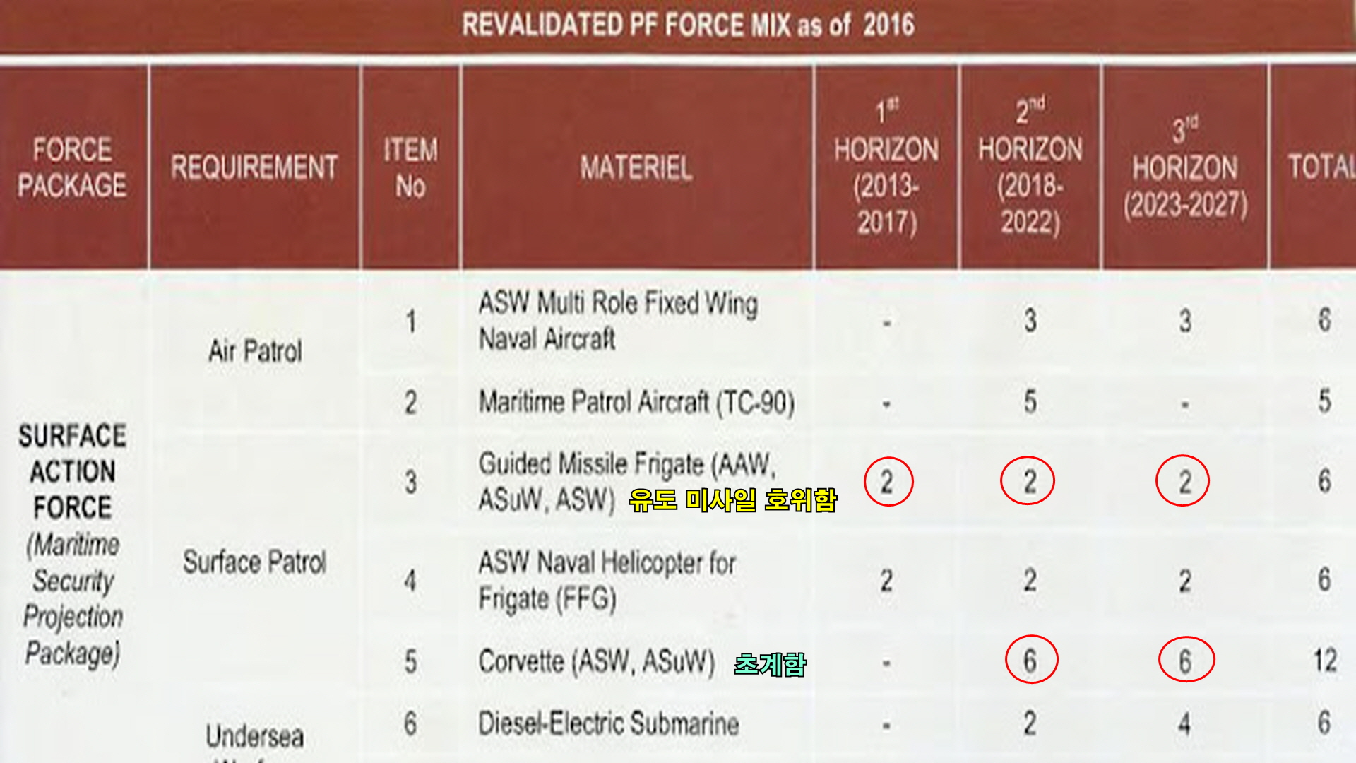MaxDefense가 공개한 필리핀 해군 전력구성 목표를 보면 필리핀 정부는 당초 2027년까지 호라이즌 사업을 3차례 진행하여 유도 미사일을 탑재하고 있어 대공전, 대함전 그리고 대잠전이 가능한 호위함(frigate)을 6척 확보하고, 대함전과 대잠전이 가능한 초계함(corvette)을 12척 확보하겠다는 계획을 세워놓고 있었음을 알 수 있습니다.